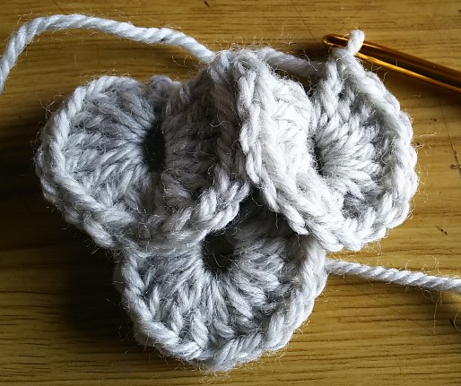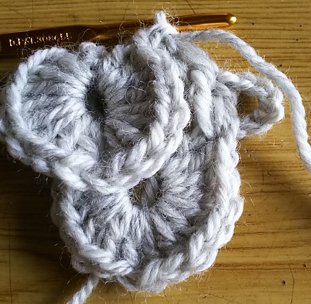 ②で編んだ2目の長編みを①と同じ要領で編みくるんで行きます。