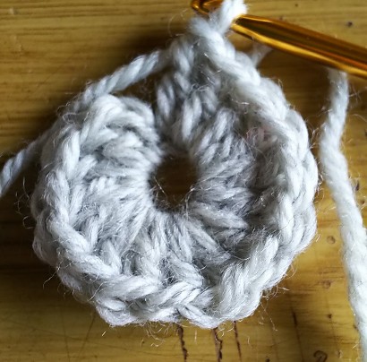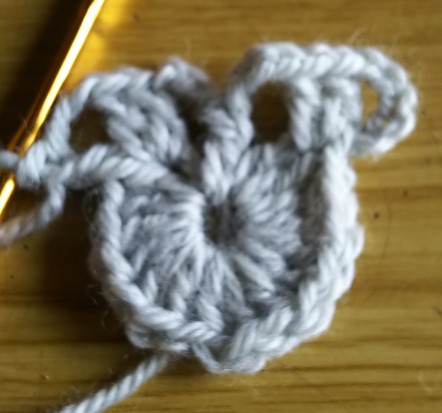 つまり合計6目の鎖編みを編んだら糸をかけて最後の長編みの足に針を入れて長編み2目編み