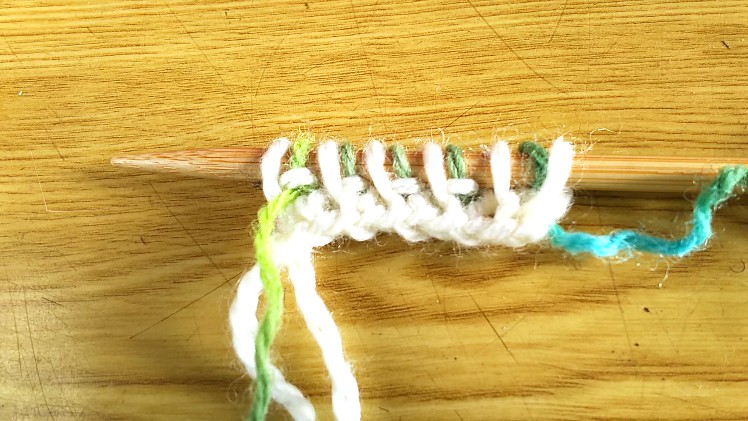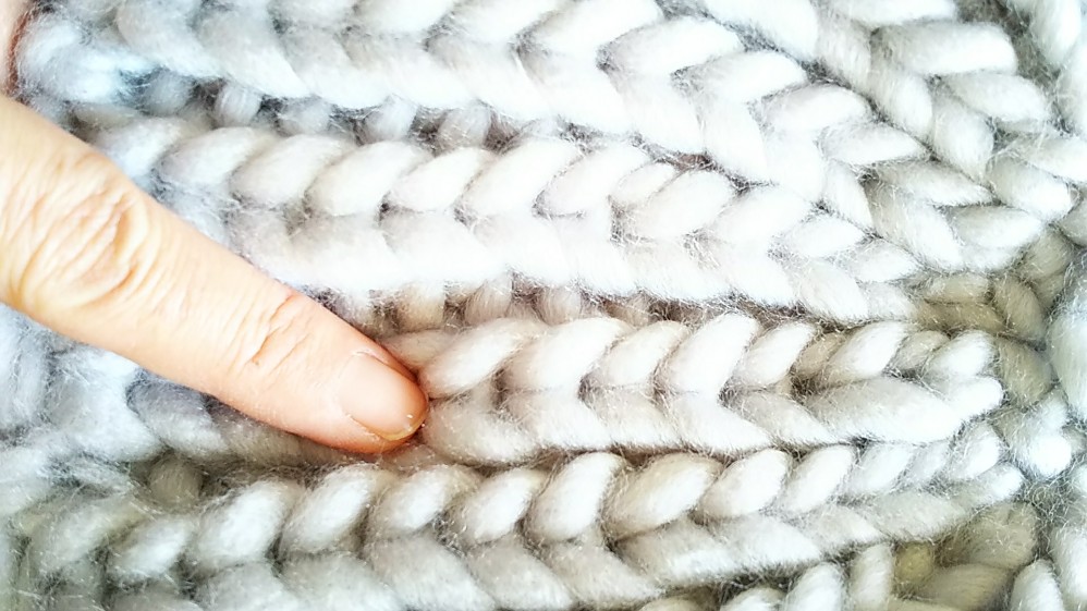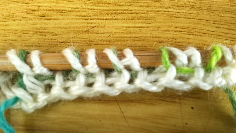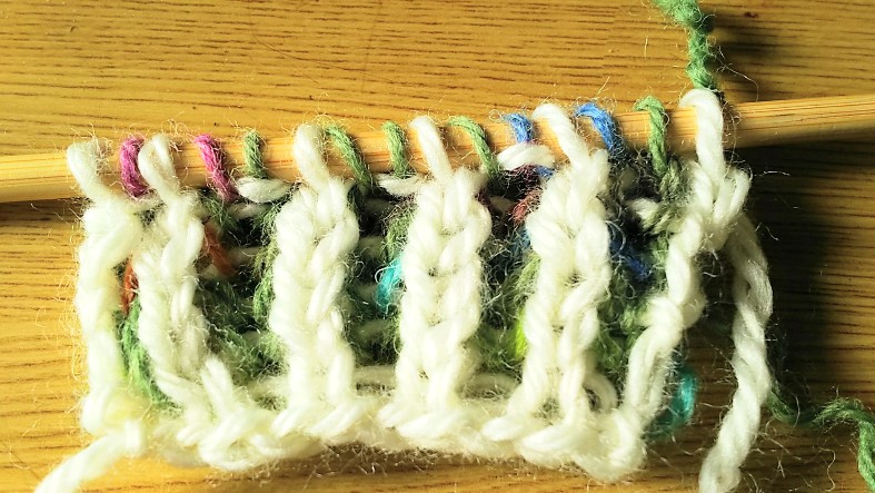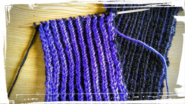 イギリスゴム編みのリバーシブル編みでマフラー編んでます。