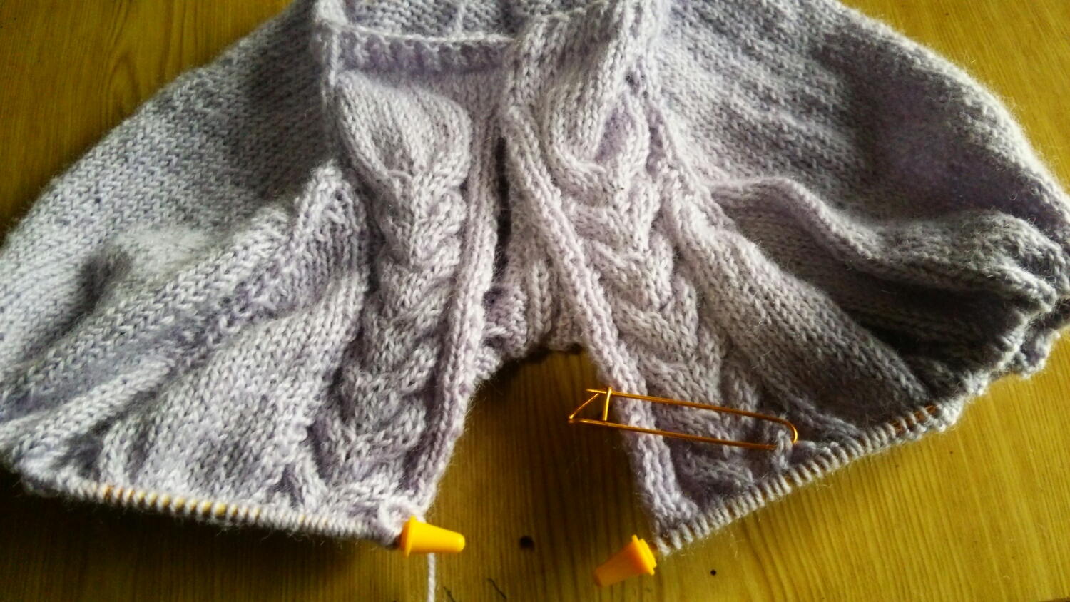 裾から輪編みで編んで、程よき所で後ろと前の身頃を編んで